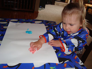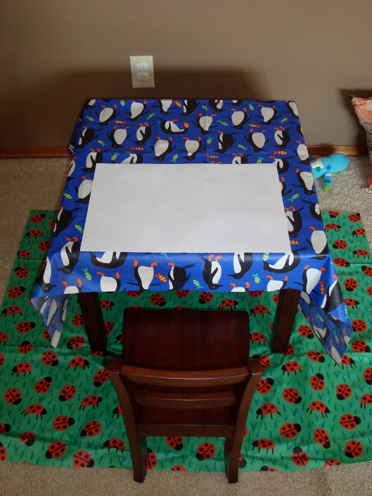 I set up this lovely area at Farrah’s table. I wanted to make sure that this would not get on the carpet! Food coloring could stain!