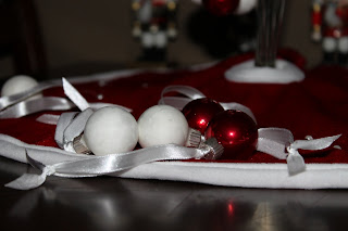 Set out the ornaments with the ribbon (ribbon is larger than the little tiny ornament hooks and easier for the little ones to control)