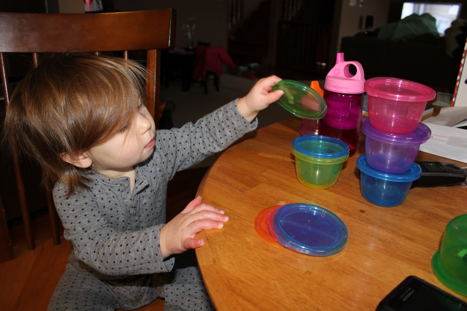 We have been using these “take and Toss” containers since I started making Farrah’s baby food and lately we find that they just don’t hold enough for my adorable little piggy! So my first thought was to give her one of each color for her new kitchen (a Christmas present she knows NOTHING about!) and then she stole them and started to play. So now, half went to the kitchen, half when to her learning trunk. Okay, so we don’t really have a learning trunk, but wouldn’t that be awesome?!