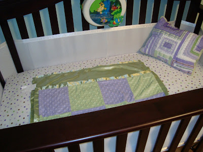 Here is a picture of some of the bedding… The bumper is temporary, until the new one comes in (backordered until June), the blanket is so soft that I am thinking of sleeping with it myself, and the pillow in the upper right is the mix/match pattern that the rest of the bedding will be in when it finally arrives! 🙂