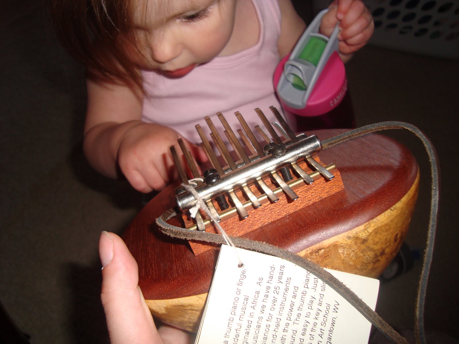 Nana and PopPop got us a really cool Thumb Piano a while back… who would have thought that this dull looking brown piece of wood would hold ANY interest for Farrah. Mom and Dad think it is awesome looking and beautiful and the sound is just lovely… but to a toddler, just sitting on a shelf, practically blending in with the color of our walls… really?!