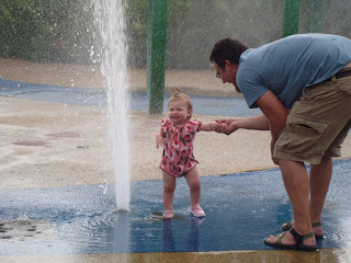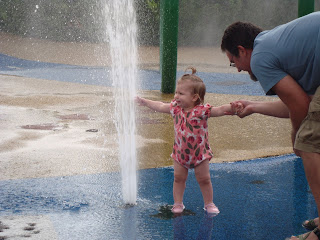 Here we are in uptown Normal this past weekend. There is a snazzy new water fountain that we can walk through, so we did!