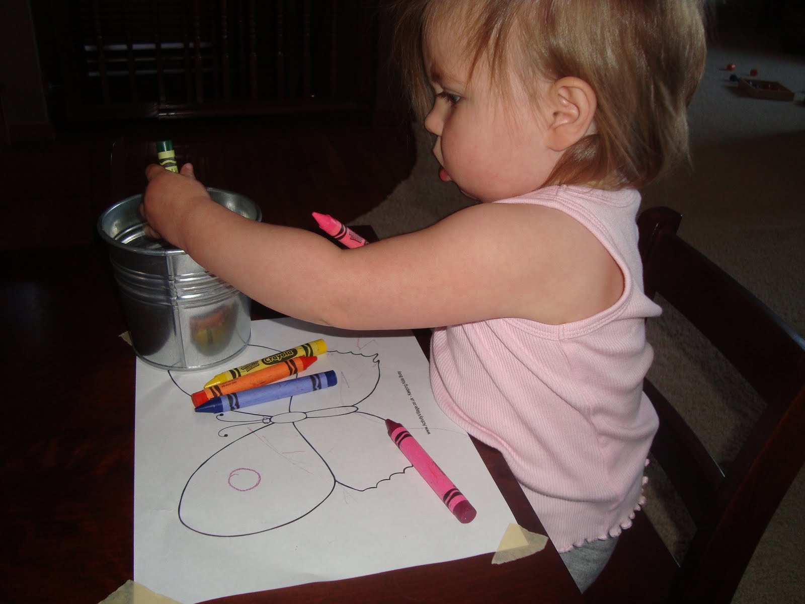 Following this, Farrah decided that she wanted to color! I placed one of each color crayon in a great little pot I got from Ikea, taped a picture of a butterfly (to try and tie in the sticker activity for some continuity) to the table and let her go… She took a couple of strokes with the crayons and then proceeded to remove the crayons one by one until the pot was empty. When she succeeded in removing the crayons and making sure that they would not roll off of the table, she then placed them back into the pot, one by one.