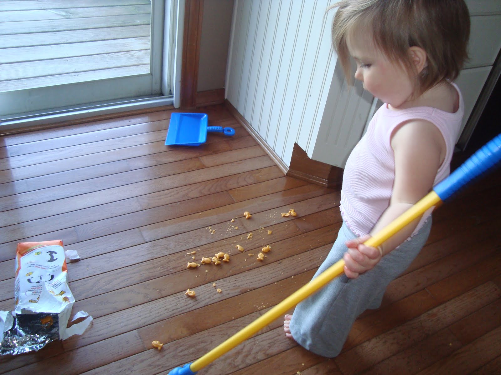 Later in the evening, as Michael was getting dinner ready, Farrah decided that her learning experience was just not quite done for the day! (This was most definitely Mommy’s fault!). I handed Farrah the bag of goldfish, thinking that there were not too many left… I was wrong! They were dumped all over the floor… OUT and then Farrah began to pick them up, one by one, and place them back into the bag. Of course, she would place two in the bag and eat one in the process… 5 second rule right?