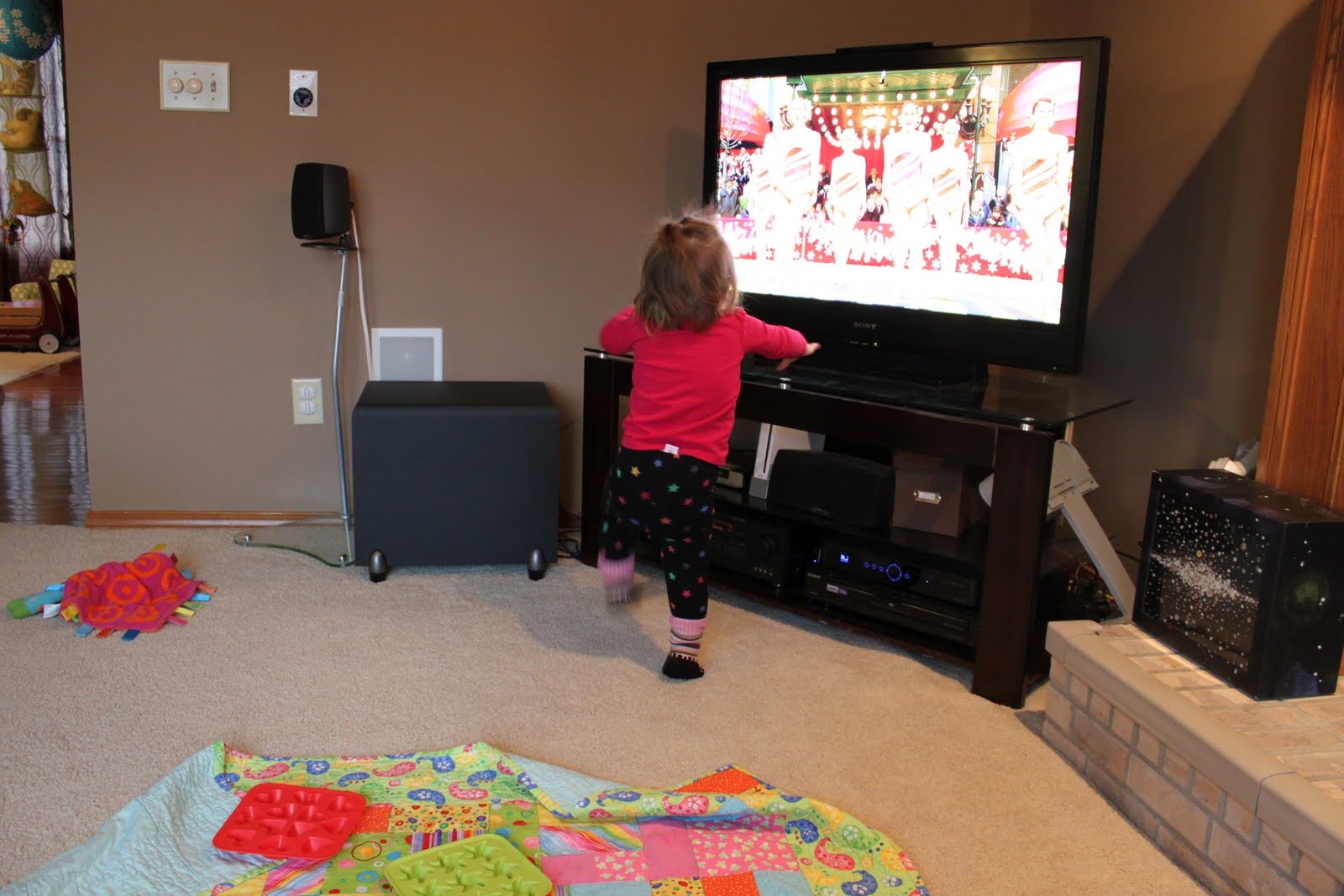 So… this year, while watching the parade, whenever she heard music she would dance and when the act was leaving the carpet she would ask for “more” and “again” as more music made it’s way onto the screen! She even tried to kick with the Rockettes… This was etched in her brain in 2009 as she watched the parade with MY family. It’s nice to know she remembers (wink, wink).